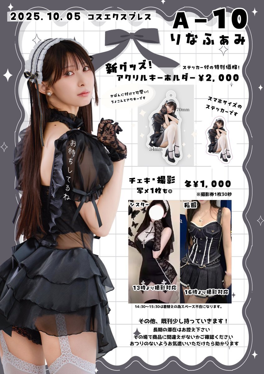 🩶ིྀ 10/5(日)コスエクお品書き🩶ིྀ リポスト拡散喜びます˖⊹ 冬コミ不参加なので今年最後の即売会になりそう💭新グッズ、チェキや撮影券もご用意しました✨ 当日は「A-10」りなふぁみ 会いにきてくれたら嬉しいです♥