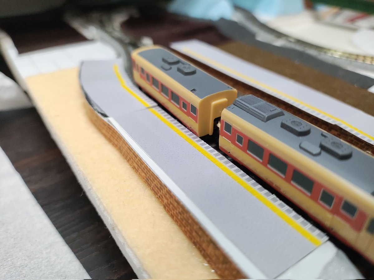 2つ目のホーム完成 がちょっと長さ足らず 曲線部分をタイル一枚ずつ貼るこだわり #Zゲージ #MicroPython #ロクハン pic.x.com/d1jWQIn7p1