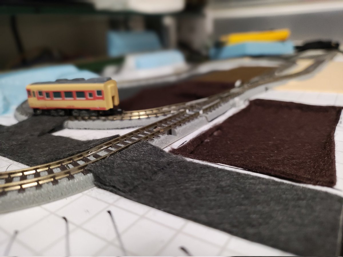 100均のフェルトで工作 湿った土、乾いた土、アスファルト 加工しやすくていい感じ 道路の傾斜の慣らしは尖った工具で引っ掻くだけ #Zゲージ #MicroPython #ロクハン pic.x.com/mLjiVyMUoE