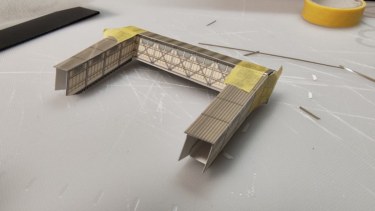 跨線橋をペーパークラフトで作成中 またL版印刷 1/220だから小さい テープ糊が大活躍! 仕上げにボンドで補強 #Zゲージ #MicroPython #ロクハン pic.x.com/1ftDMMLumH