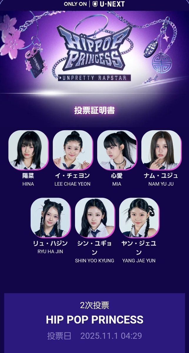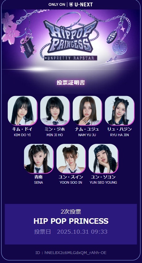 【 #HIPPOPPrincess 】2次投票完了🗳️ あなたも今すぐ投票しよう! hippop.unext.jp 💎私が投票したのは⋯ hippop.unext.jp/vote_certifica… 毎週木曜22:02〜 U-NEXTで独占配信! #ヒポプリ #Mnet #MnetPlus #UNEXT