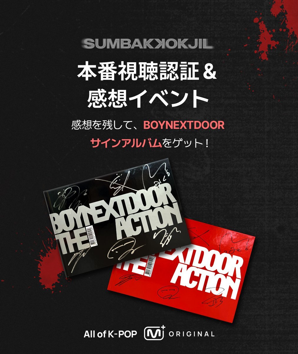 [#MnetPlus] 𝑺𝑼𝑴𝑩𝑨𝑲𝑲𝑶𝑲𝑱𝑰𝑳(숨바꼭질) #BOYNEXTDOOR 本番視聴認証&感想イベント🎁 ついにメインエピソード公開! EP.15~16を視聴し、一番楽しかったシーンをキャプチャして 𝕏(Twitter)に感想を投稿しよう💬 抽選で12名様に #BOYNEXTDOOR の直筆サイン入りアルバムをプレゼント 💌 pic.x.com/jRKOVBzQwn