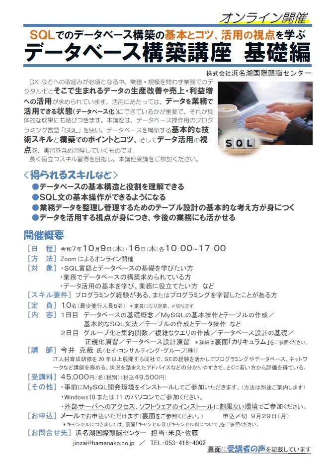 『データベース構築講座 基礎編』オンライン開催 ■詳細 hamanako.jp/info/0254.html データベースプログラミング言語「SQL」を使い、データベースを構築する基本的な技術スキルと構築でのポイントとコツ、そしてデータ活用の視点を、ハンズオンを含め習得していきます。 #データベース #SQL #ITスキル