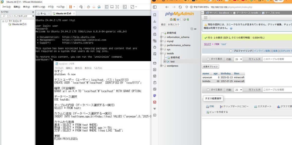 データベースを練習中...(phpmyadminは確認用に入れてみました) メモ帳は調べたやつをカスタマイズしただけなので、実務的にはダメな感じがするな.. #初心者プログラミング #データベース #mysql #phpmyadmin pic.x.com/UnbASdiIXc