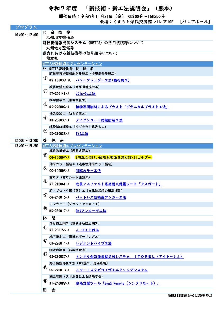 令和7年度「新技術・新工法説明会」[#熊本]/九州地方整備局 九州技術事務所 ■11月21日(金)くまもと県民交流館パレア・参加費:無料(要事前申込) qsr.mlit.go.jp/shingijyutu/se…NETIS技術紹介:CS-21ビルダー(NETIS:CG-170009-A) ※発表者:アストン協会・九州地区担当:(株)計測技研 #NETIS pic.x.com/UekAf8UYph