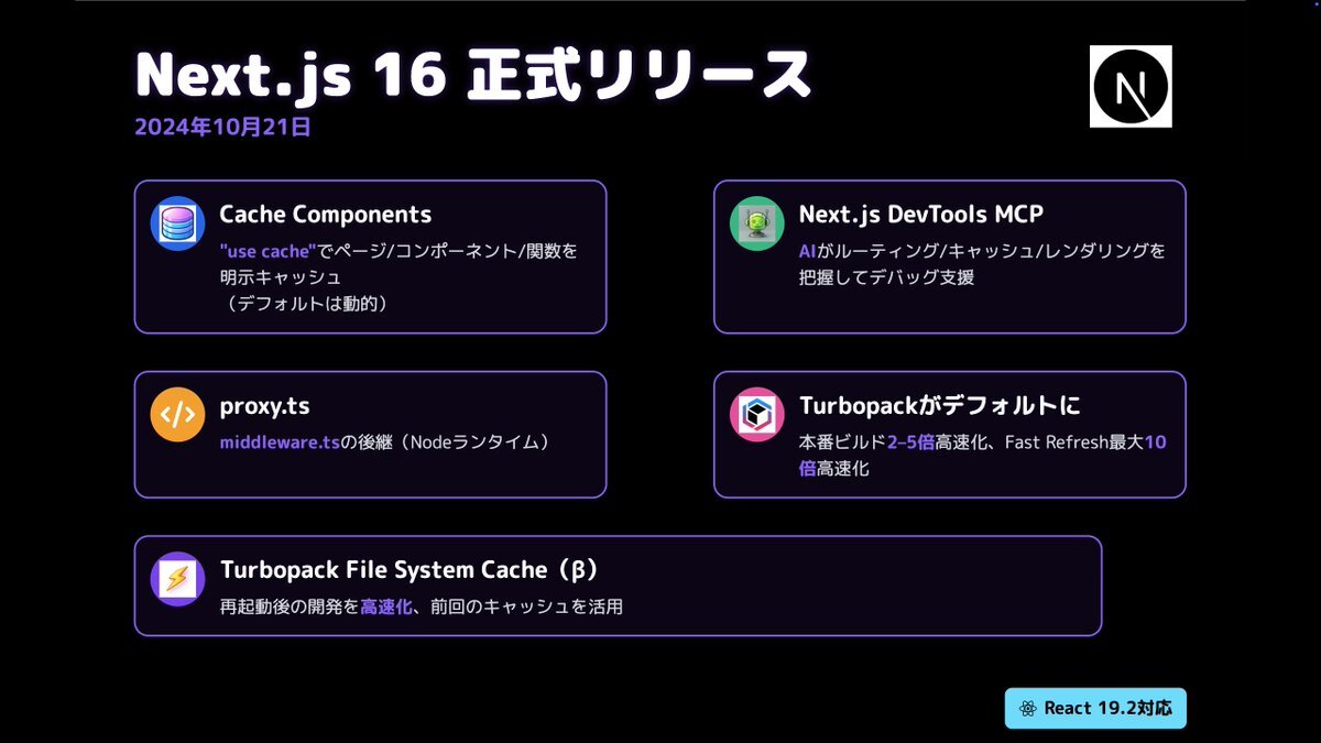 Next.js 16、何が変わる? 画像1枚でワードだけ抑えられます! ✅ ビルド2–5x/最大10xリフレッシュ ✅ 関数やコンポーネントを明示キャッシュ ✅ Next.jsのMCP 個人的には、Next.js DevTools MCPが一番熱いですが、 これまでのバージョンアップの中では控えめですね #Nextjs #Nextjs16 #MCP pic.x.com/uhjSciX8zC
