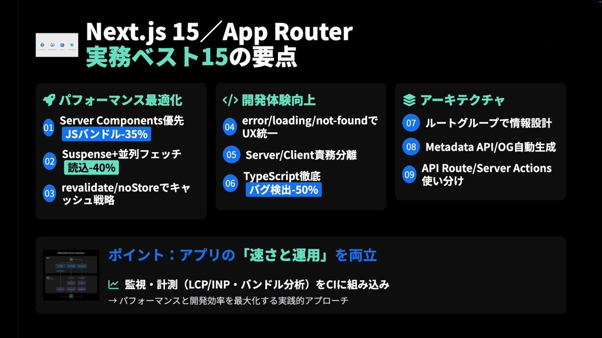 🛠️Next.js 15を“速く・壊れにくく” App Routerのベストプラクティス15項を1枚にまとめてみました! 設計の判断基準と数値目安つき 画像で要点を一気見👇 #Nextjs #AppRouter #React #ServerComponents #Webパフォーマンス #TypeScript #フロントエンド pic.x.com/Jumy6zZKpt