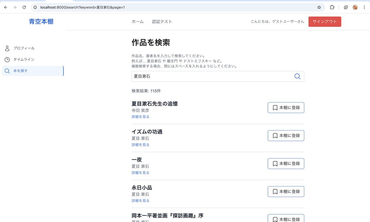 読書記録アプリの本検索ページが完成しました! 青空文庫の作品をキーワードで検索できます。 これから本棚ページとビューワーページを実装していく予定です。 #個人開発 #Nextjs #RailsAP pic.x.com/Y665YAjHSG