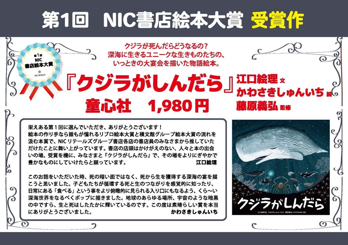 「リブロ絵本大賞」と「積文館グループ絵本大賞」を統合し、あらたに「NIC書店絵本大賞」を創設しました。 第1回「NIC書店絵本大賞」受賞作は『クジラがしんだら』(童心社)に決定! nic-retails.co.jp/info/9307/ #NIC書店絵本大賞 #クジラがしんだら #童心社 pic.x.com/mtsU84lrjQ