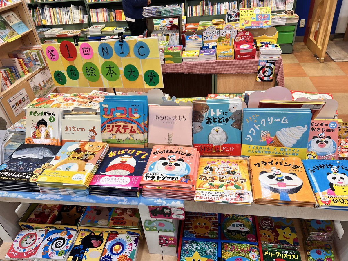 続いて #ブックセンタークエスト小倉店 さんへ #NIC書店絵本大賞 のコーナーが! #こねこねねこのねこピッツァ #kadokawa #だじゃれっしゃ #交通新聞社 #ぼくはキリン #303BOOKS もあった。 pic.x.com/p1JvtopMf1 x.com/kawadakuniko/s…