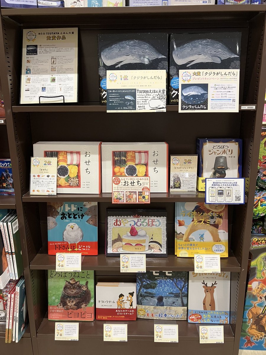 *:⭐︎BOOKフェア情報⭐︎:* 第6回 #TSUTAYAえほん大賞 受賞作発表🏅 1位は #NIC書店絵本大賞 なども受賞している『#クジラがしんだら』です🐳 児童書コーナーでフェアを開催中✨ ぜひお立ち寄りください! pic.x.com/oXlqTUbXJe