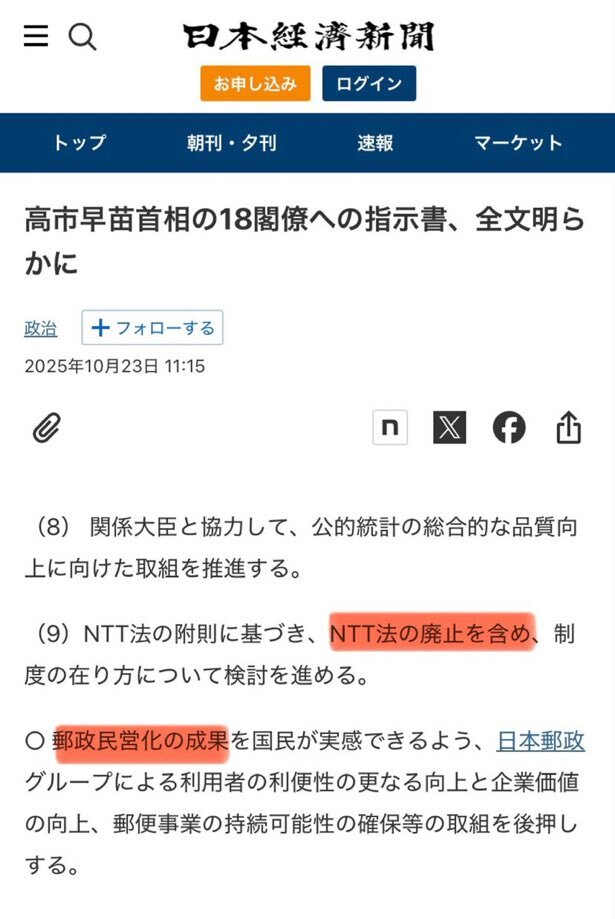 高市首相が総務大臣に「NTT法の廃止を含め、制度の在り方について検討を進める」ことを指示しています! 日本のサイバー防衛や日本のすべての重要機関の基幹通信の安全保障など、国防上からも、NTT法の廃止は絶対にありえません!高市しつこい!🤬 #NTT法廃止 #安全保障 #国防 #サイバー防衛 #NTT x.com/MoeFukada/stat…