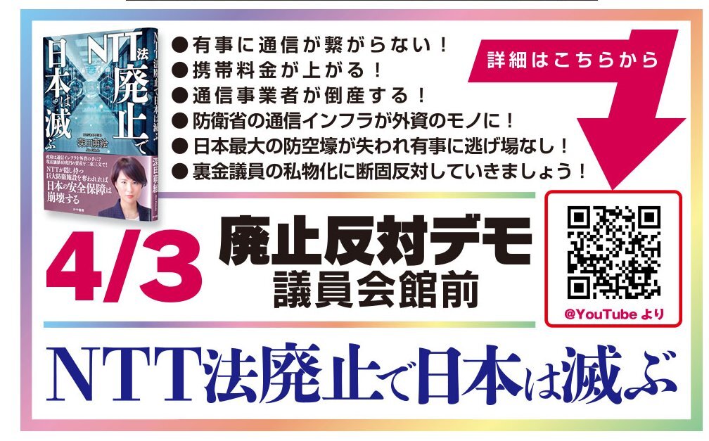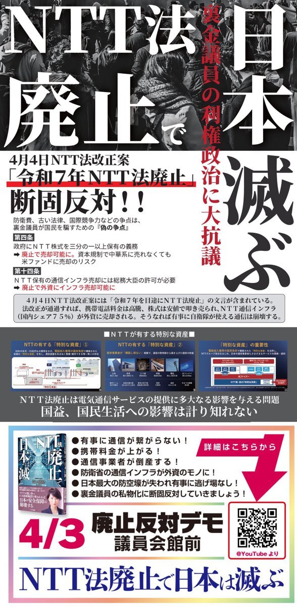 裏金問題、万博問題、政治家の不適切言動、紛争問題、物価高騰、経済問題、ロスジェネ問題等々、政治課題は多すぎるけど、 今日時間がとれる人はNTT法廃止を止める為のデモに参加して、売国議員達に国民の怒りを届けて欲しいです。 #売国止めろNTT守れ #NTT法廃止で日本は滅ぶ pic.x.com/cULdYCZuMc