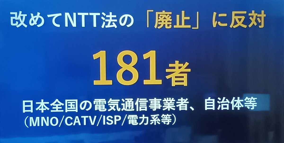 NTT以外の全国の通信事業者で181者がNTT法廃止に反対。NTTの通信インフラを使っているKDDI、ソフトバンク、楽天モバイル、日本ケーブルテレビ連盟も反対意見書を提出しています。 #NTT法廃止で日本は滅ぶ #売国止めろNTT守れ pic.x.com/JkGTrbxds1