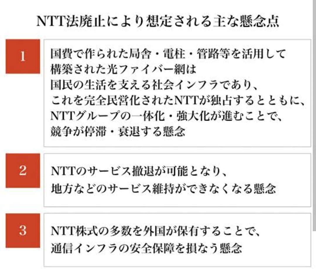 NTT法の廃止で以下の可能性 ・有事に通信が繋がらない ・携帯料金爆上げ ・通信事業者が倒産 ・通信インフラが外資の物に ・日本最大の防空壕が失われる ⇩⇩ NTT法を廃止するという事は外資に株を売却する事ができるという事 #NTT法廃止で日本は滅ぶ #裏金議員の利権政治を許さない pic.x.com/JkyEJvTzP2 x.com/MoeFukada/stat…