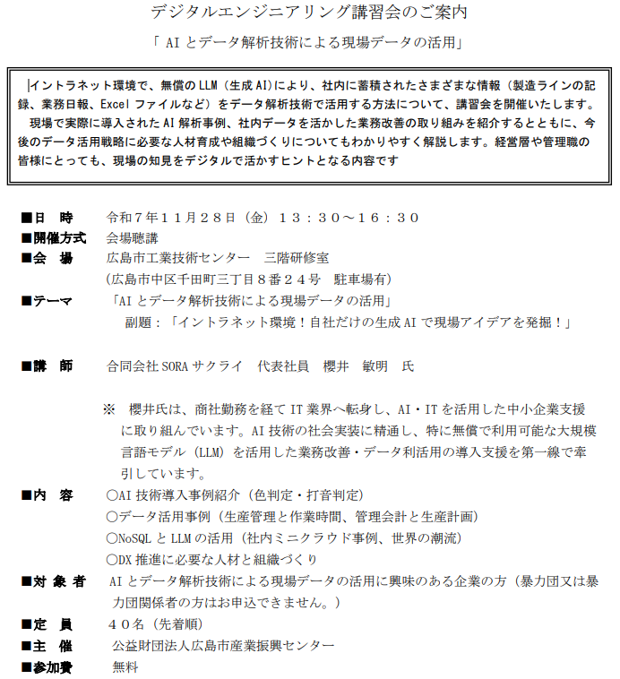 令和7年度 #デジタルエンジニアリング #講習会 を開催します! テーマ「AIとデータ解析技術による現場データの活用」 日時:令和7年11月28日(金)13:30~ itc.city.hiroshima.jp/koshukai/R07-D… (PR) 11月中旬より #技術職員 (#機械 #化学) を #募集 開始 #IT #AI #LLM #NoSQL #SORA #サクライ #求人 #hiroshima pic.x.com/oijJcOz1TN