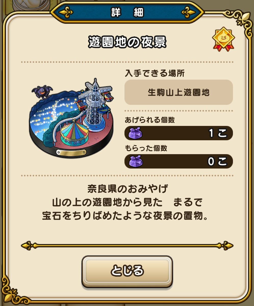 【ドラクエウォーク おみやげシーズン2】 #Nsaoiのドラクエウォークおみやげ旅 奈良県 生駒山上遊園地 ⚠️遊園地の外側の道路から◯ ⚠️時間、天候、料金注意 ・信貴生駒スカイラインを通って車で行きました ・道路営業時間:6:30〜23:00 ・通り方によって料金1900円になったのでお気をつけください pic.x.com/Tg28OoWWwZ