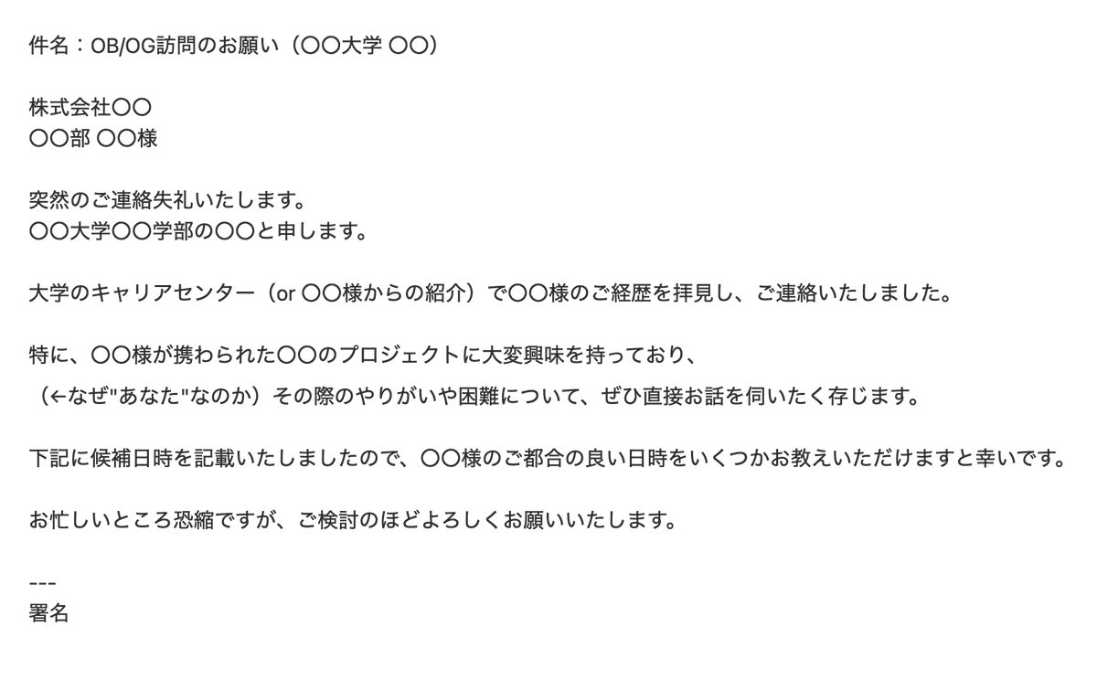 【コピペ厳禁】 OB訪問依頼メールのテンプレート。「お話を聞かせてください」だけでは返信率は低いです。相手が「会うメリット」を感じる一文を加えるのが鍵。「なぜあなたなのか」を明確に伝えましょう。この例文のポイントを真似すれば、返信率も変わってくるはずです。 #就活 #OB訪問 #27卒 pic.x.com/GWMh09n2TP