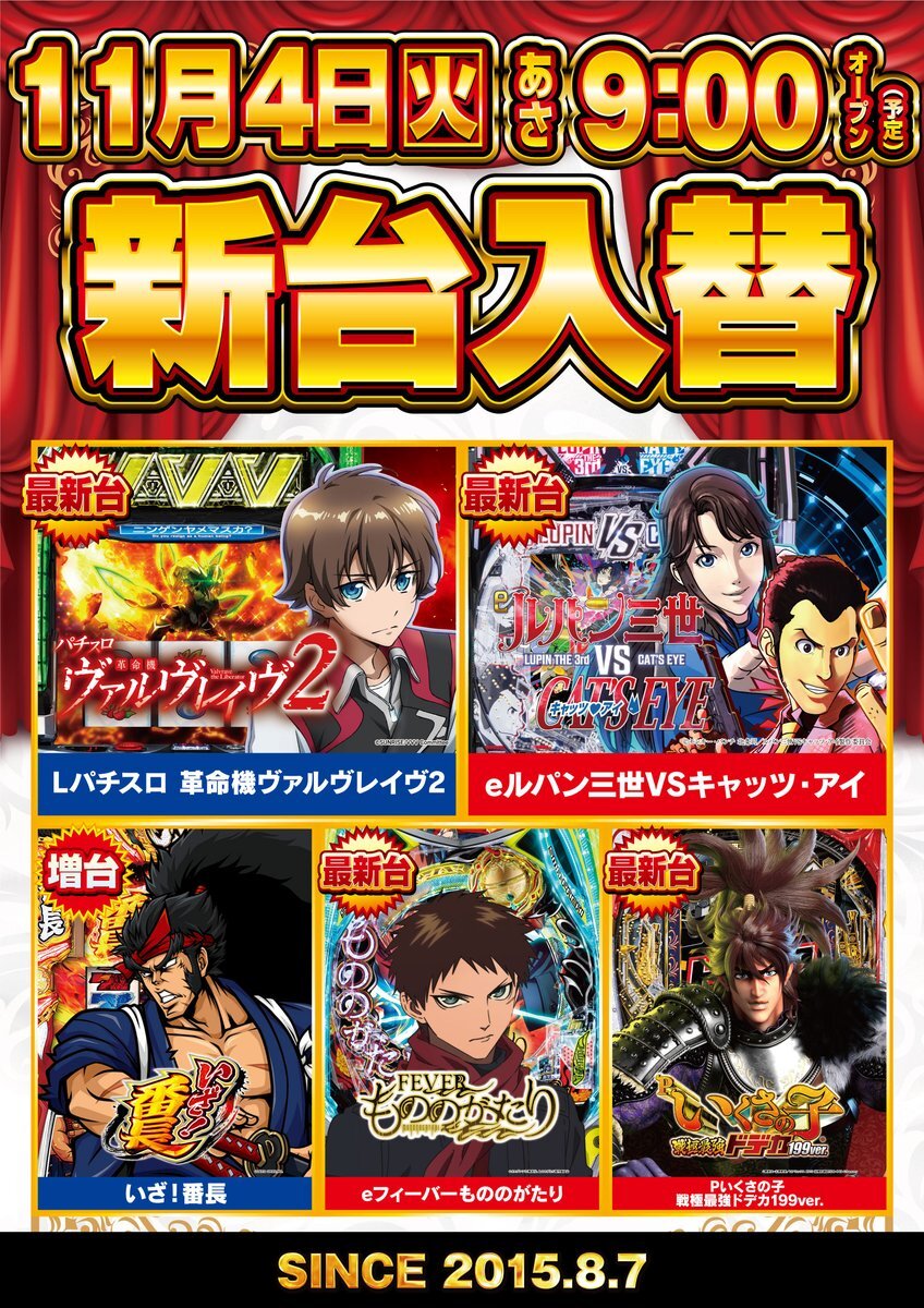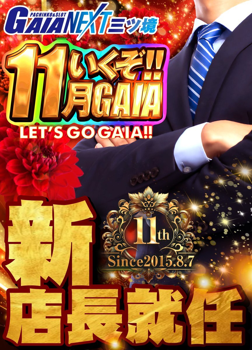 ガイアネクスト三ツ境🕋 ‼️11月いくぞ‼️GAIA 👔✨新店長就任✨👔 ✨11月4日(火)✨  ✨#新台入替✨ ✨9時OPEN✨ 【最新台】多数登場‼️ #eルパン三世VSキャッツアイ #L革命機ヴァルヴレイヴ2 #Pいくさの子戦極最強 #eフィーバーもののがたり #PReゼロ鬼がかり99ver #Lいざ番長 増台‼️ pic.x.com/2boKNZGzQT