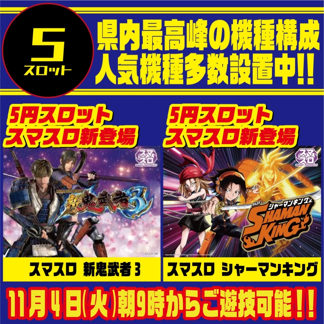 本日📣#11月4日 朝9時開店✨新台入替(予定) ▶️#L革命機ヴァルヴレイヴ2 ▶️#Lいざ番長 #増台 ❇️#eFもののがたり ❇️#eルパン三世VSキャツアイ ❇️#Pいくさの子戦極最強ドデカ199ver 🌈新台16機種27台導入予定です 朝の入場抽選はオンライン抽選です! 是非ご参加下さい📲 ご来店お待ちしてます🥳 pic.x.com/8OfPEPg5Up