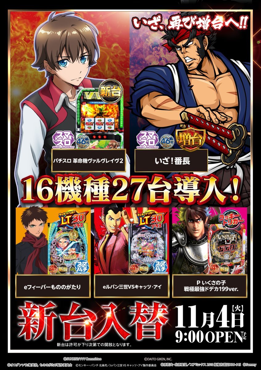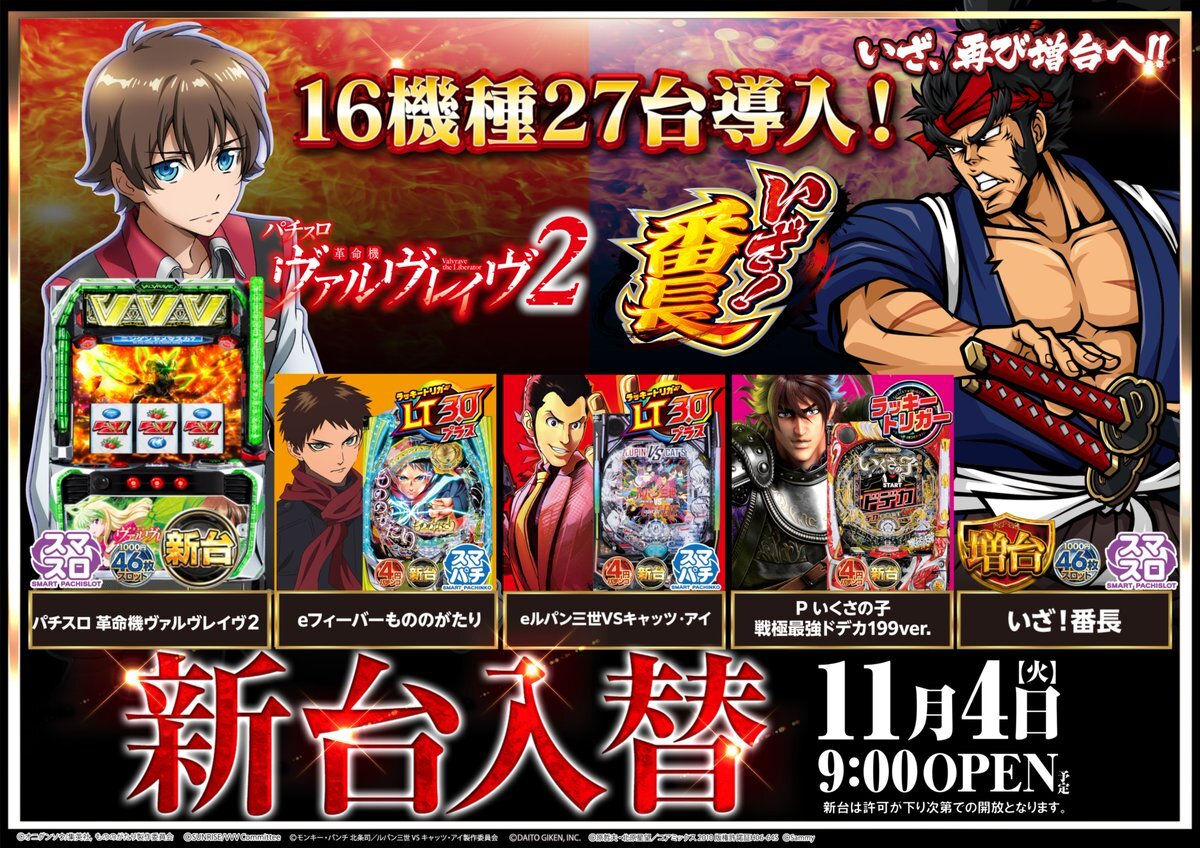 明日📢#11月4日(火)朝9時OPEN✨ 新台入替(予定) ▶️#L革命機ヴァルヴレイヴ2 ▶️#Lいざ番長⚔️#増台 ❇️#eFもののがたり ❇️#eルパン三世VSキャツアイ ❇️#Pいくさの子戦極最強ドデカ199ver 🌈新台16機種27台導入予定です‼️ 皆様のご来店を心よりお待ちしております🤗 #新台入替 pic.x.com/8hRmuzG2bB