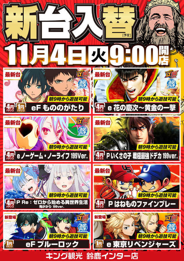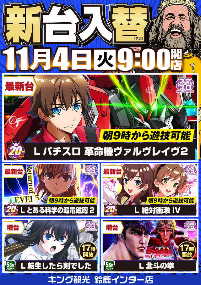 おはようございます☀️ #キング観光鈴鹿インター店 です 11月4日【火】 最新台朝9時から遊技可能‼️ #Lパチスロ革命機ヴァルヴレイヴ2 #L絶対衝激IV #スマスロとある科学の超電磁砲2 #eFもののがたり #e花の慶次~黄金の一撃 #Pいくさの子戦極最強ドデカ199ver. ご来店お待ちしております😆 pic.x.com/IR2hF3w8ki