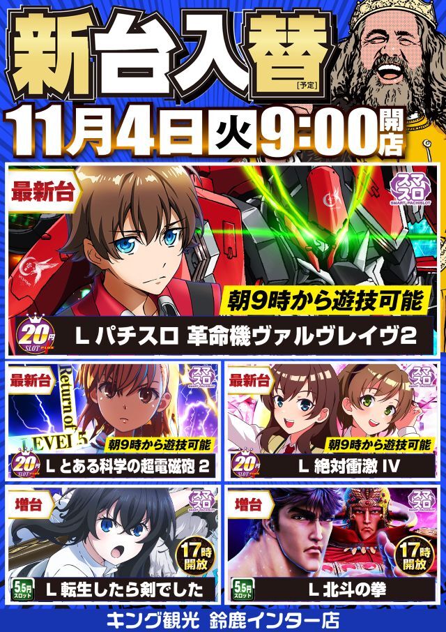 皆様こんばんは #キング観光鈴鹿インター店 です 11月4日【火】新台入替 最新台朝9時から遊技可能‼️ #Lパチスロ革命機ヴァルヴレイヴ2 #L絶対衝激IV #スマスロとある科学の超電磁砲2 #eFもののがたり #e花の慶次~黄金の一撃 #Pいくさの子戦極最強ドデカ199ver. ご来店お待ちしております😆 pic.x.com/A662ZKy2Pm