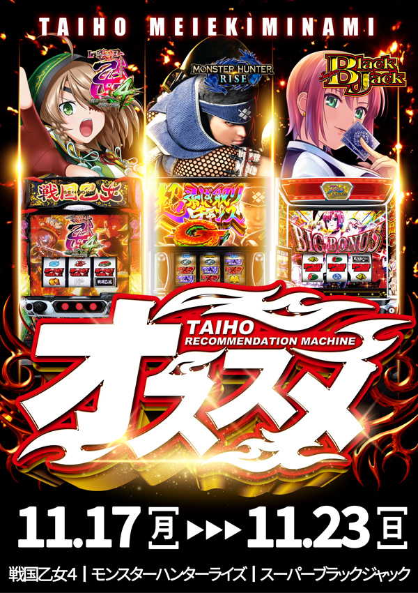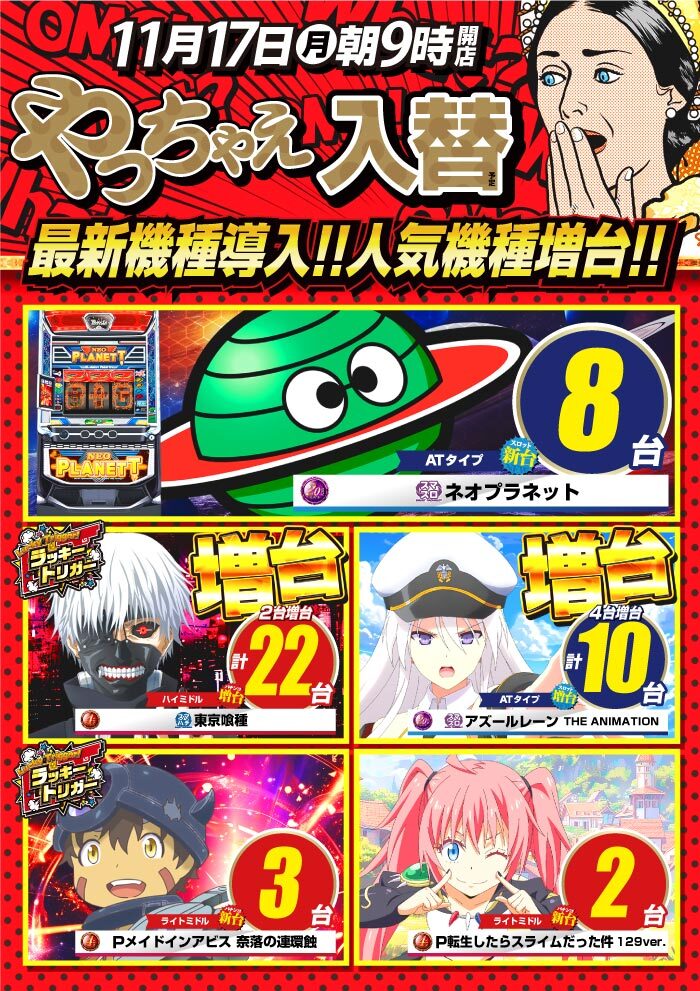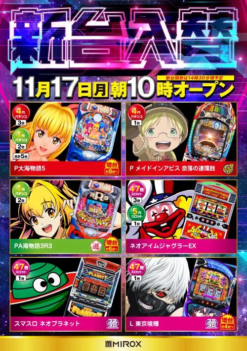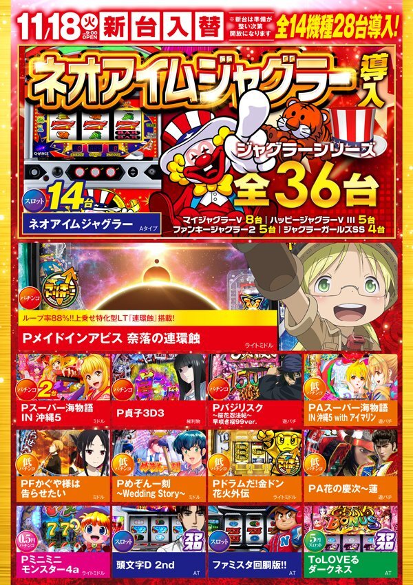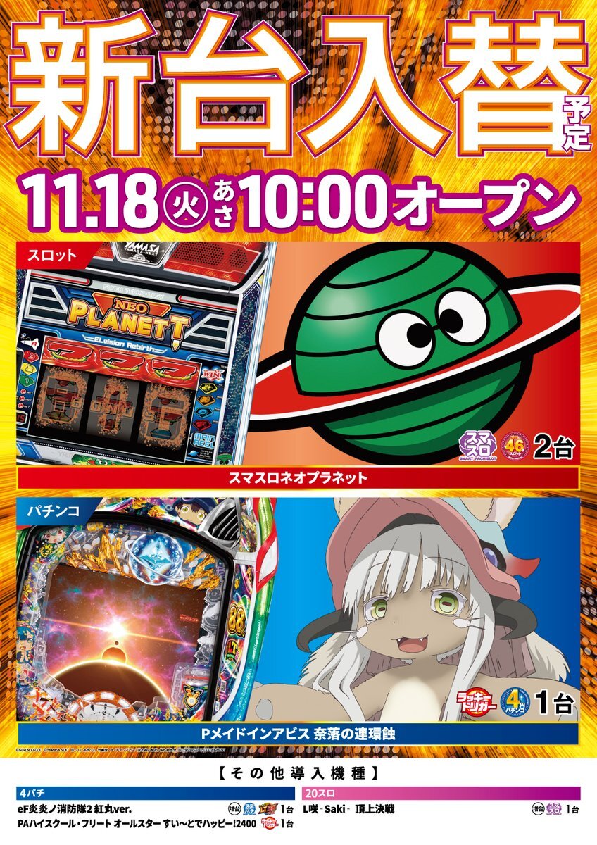 こんばんは🌛11/18火曜日は #新台入替 👏話題の最新機種をはじめ、リクエスト頂いた機種も導入で全14機種の導入😀オススメ機種もお見逃しなくッ😊明日もタイホウ名駅南店でお楽しみください #タイホウ #ネオアイムジャグラーEX #Pメイドインアビス奈落の連環蝕 pic.x.com/ipV8MWB9BR
