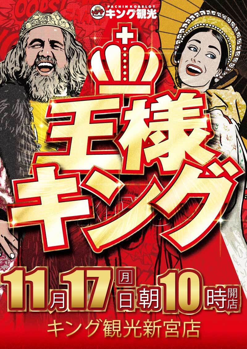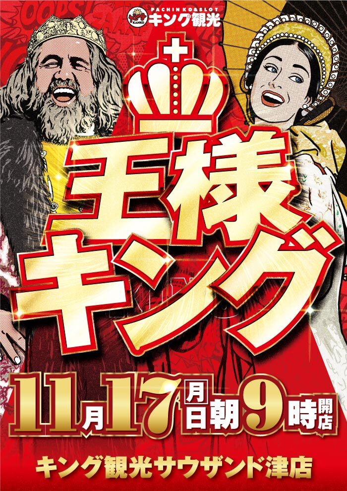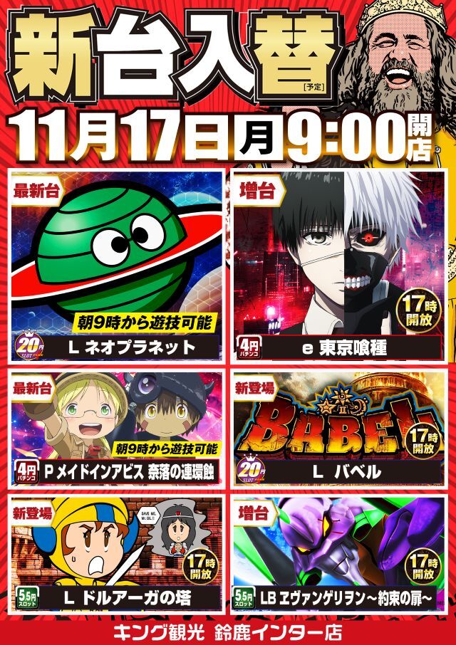 皆様こんばんは #キング観光鈴鹿インター店 です‼️ 11月17日【月】朝9時開店‼️ #王様キング‼️ #新台入替 最新台朝から遊技可能 #Pメイドインアビス奈落の連環蝕 #スマスロネオプラネット 17時開放 #e東京喰種 増台 #Lバベル 新登場 入場は8:40に並替抽選予定🍀 ご来店お待ちしております‼️ pic.x.com/RxqXw4ae0C