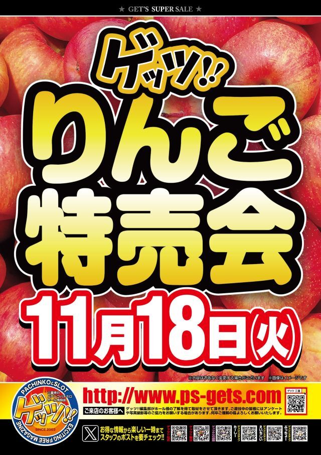 皆様こんばんは 11月18日【火】朝9時開店 ゲッツ主催 #りんご特売会🍏 《最新台好評稼働中‼️》 #Pメイドインアビス奈落の連環蝕 #スマスロネオプラネット #e東京喰種 増台‼️ #Lバベル ‼️ 5スロに #Lヱヴァンゲリヲン 増台‼️ #ドルアーガの塔 ‼️ ご来店お待ちしております pic.x.com/zdXlOfCvO1