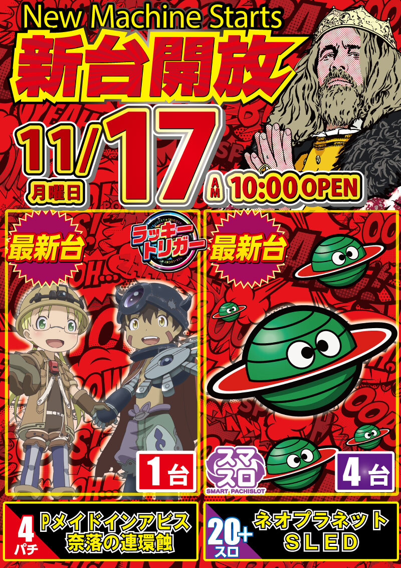 皆様こんにちは😊 11月17日【月】 👑#王様キング👑 #新台入替‼️ 《最新台好評稼働中‼️》 #Pメイドインアビス奈落の連環蝕 #スマスロネオプラネット 17時開放‼️ #e東京喰種 増台‼️ #Lバベル 新登場‼️ 5スロに #Lヱヴァンゲリヲン 増台‼️ #ドルアーガの塔 新登場‼️ ご来店お待ちしております pic.x.com/OJci2DSPA1