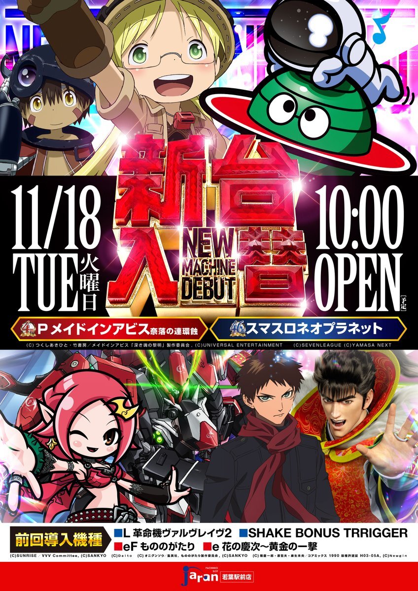 💡明日11月18日💡 ⚡新台入替⚡️ ✨10時開店✨ 入場抽選は9時45分⏰ 明日も👍ご来店を お待ちしております✨ #新台入替 #ジャラン #若葉 #Pメイドインアビス奈落の連環蝕 #スマスロネオプラネット pic.x.com/GoD1PXAsea