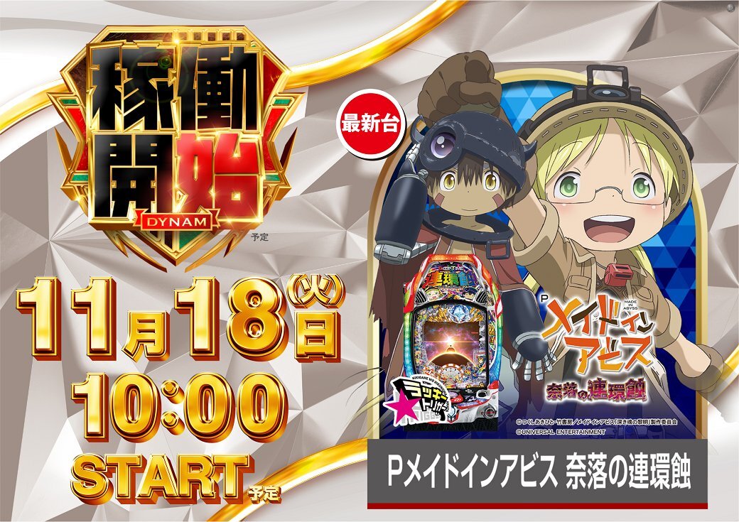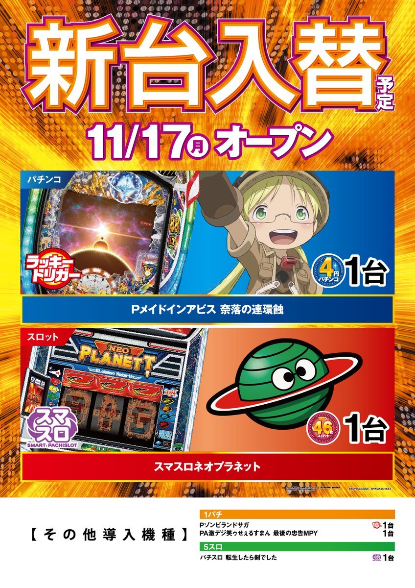 #宮キン から明日のご案内😎 #11月17日 (月)は #最新台 #Pメイドインアビス奈落の連環蝕 #スマスロネオプラネット が開放‼️ 皆様是非是非ご来店下さいませ🙏 皆様のお越しお待ちしております🎵 pic.x.com/IV1MghRFog