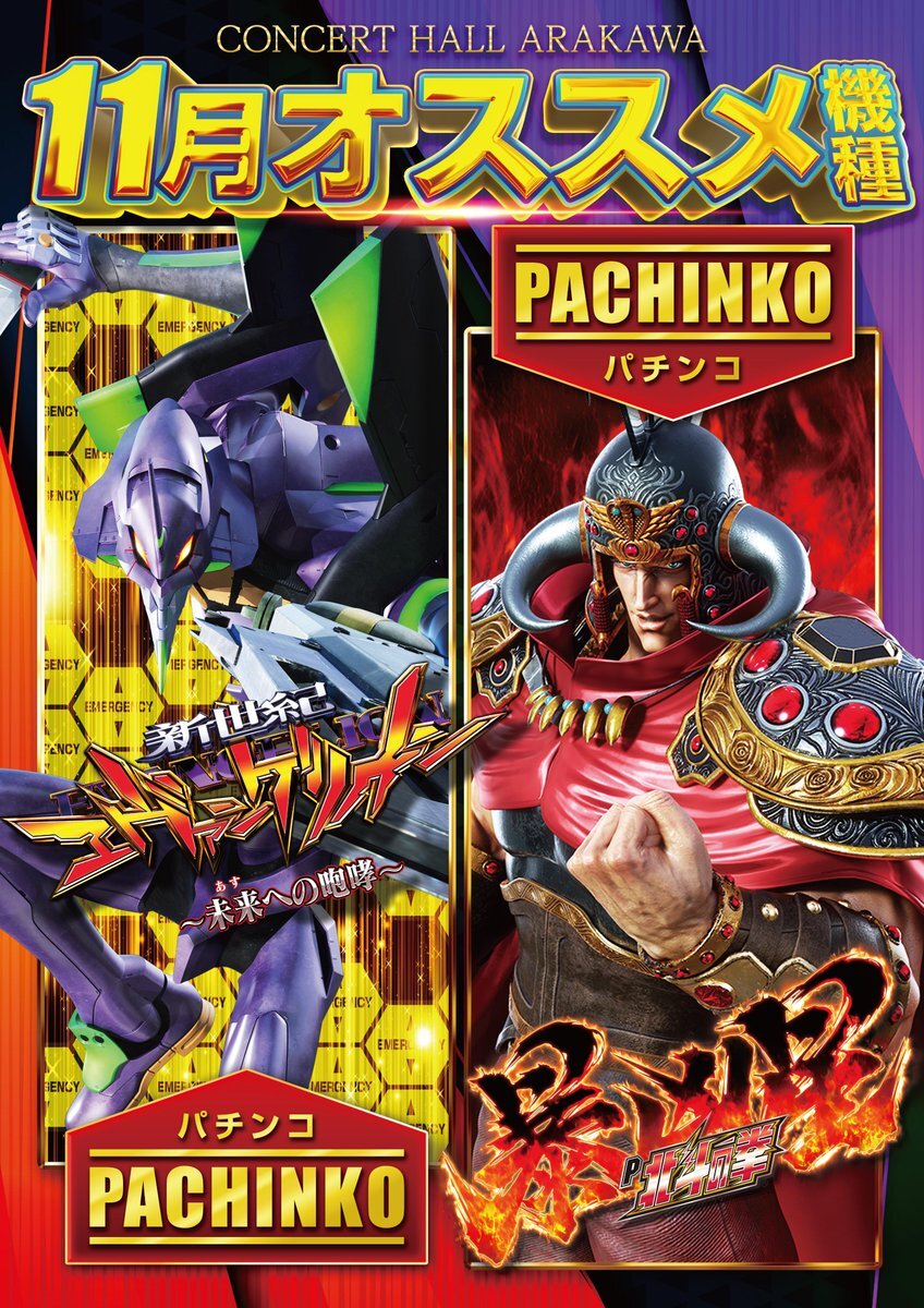 情熱ステージ #コンサートホール荒川 です 明日のご案内 11月10日(月) 🔥10:00 OPEN🔥 🆕11月10日新台入替🆕 2機種導入予定! 新台抽選は店内にて! パチンコからは月間オススメ #P新世紀エヴァンゲリオン15未来への咆哮 #P北斗の拳暴凶星 そして… pic.x.com/vVje3OiptY