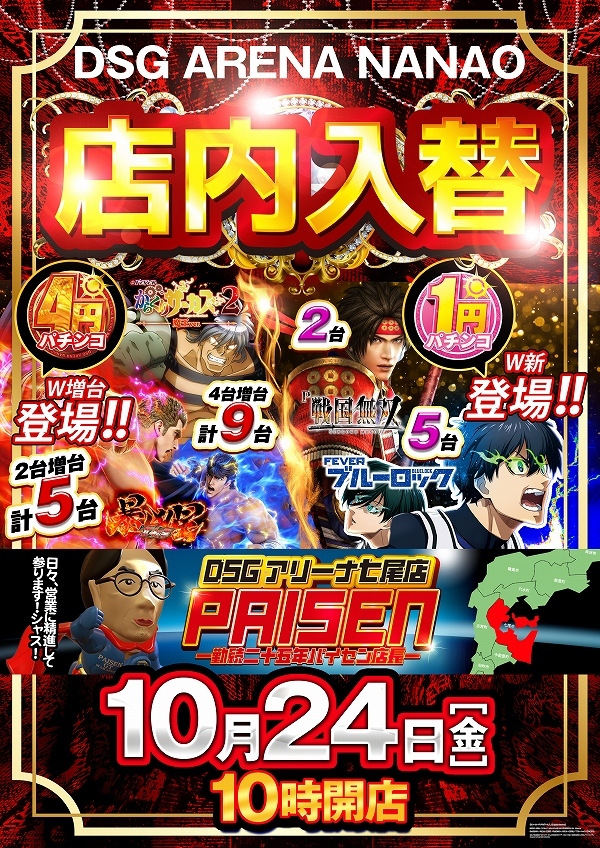 お待たせし過ぎたかもしれません‼ 🔥店内入替🔥 24日㈮10時OPEN✨ 【4円P】 #P北斗の拳暴凶星 増台計5台 #eからくりサーカス 増台9台 【1円P】 #eフィーバーブルーロック 5台 #P戦国無双 2台 俺たちはまだまだやれる👊 #金曜日のナナアリで遊ぼうぜ♬ #DSGアリーナ七尾 #新店主パイセン pic.x.com/pQW0bkwfCk x.com/paisen_dsg/sta…