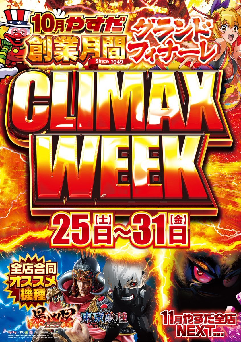 10月31日(金) 創業月間も いよいよクライマックス!! 最後を締めくくるのは ジャックル~👿 全店合同オススメ機種 #P暴凶星 #L東京喰種 11月も全店合同 一致団結プロジェクトが・・・🤫㊙ 明日も朝からやすだへGO~ 抽選時間は 9:30~開始 是非ご来店下サイ!! #やすだ柏 pic.x.com/ePdB5688nk