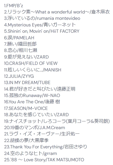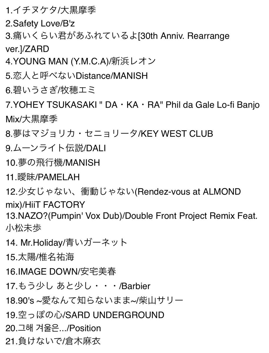 曲目はこちら(っ'-')╮=͟͟͞͞ フォ━━━━ッ!! #Beingしか勝たん #Bʼz #倉木麻衣 #RumaniaMontevideo #青いガーネット #HiiTFACTORY #PAMELAH #織田哲郎 #相川七瀬 #ZARD #FIELD_OF_VIEW #MANISH #ZYYG #Wnao #後藤樹 #Mvoice #しろコーラ(#葉月コーラ& #葵司朗) #生沢佑一 #大黒摩季 #grram とか