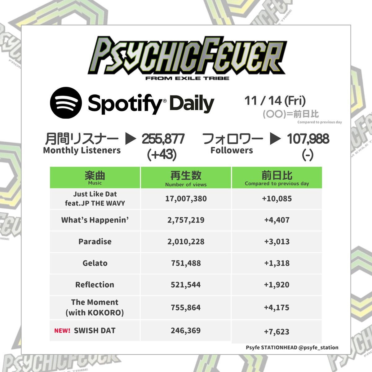 ☘️ Spotify Daily ☘️ 2025 / 11 / 14 (Fri) 休日は再生数が下がりやすくなります💦 直再生かプレイリスト再生お願いします👀 Streams tend to drop on weekends 💦 Play direct or in a playlist 👀 Spotify URL → open.spotify.com/intl-ja/artist… #PSYCHICFEVER #PCF_SWISHDAT pic.x.com/rurHt3noH0
