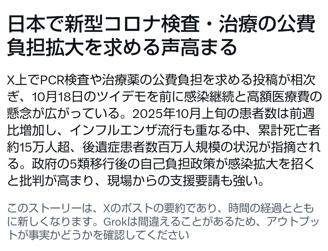 ツイデモ #PCR検査と治療薬の公費負担を求めます 《コロナは終息していません. これまでに15万人以上が亡くなり, 後遺症は推定数百万人》 《検査,治療薬,ワクチンへの容易なアクセス 換気設備整備 #LongCovid #LongVAX への支援》 先月、かかりつけ医がコロナで亡くなった。ショックすぎる。 x.com/koichi_kawakam…