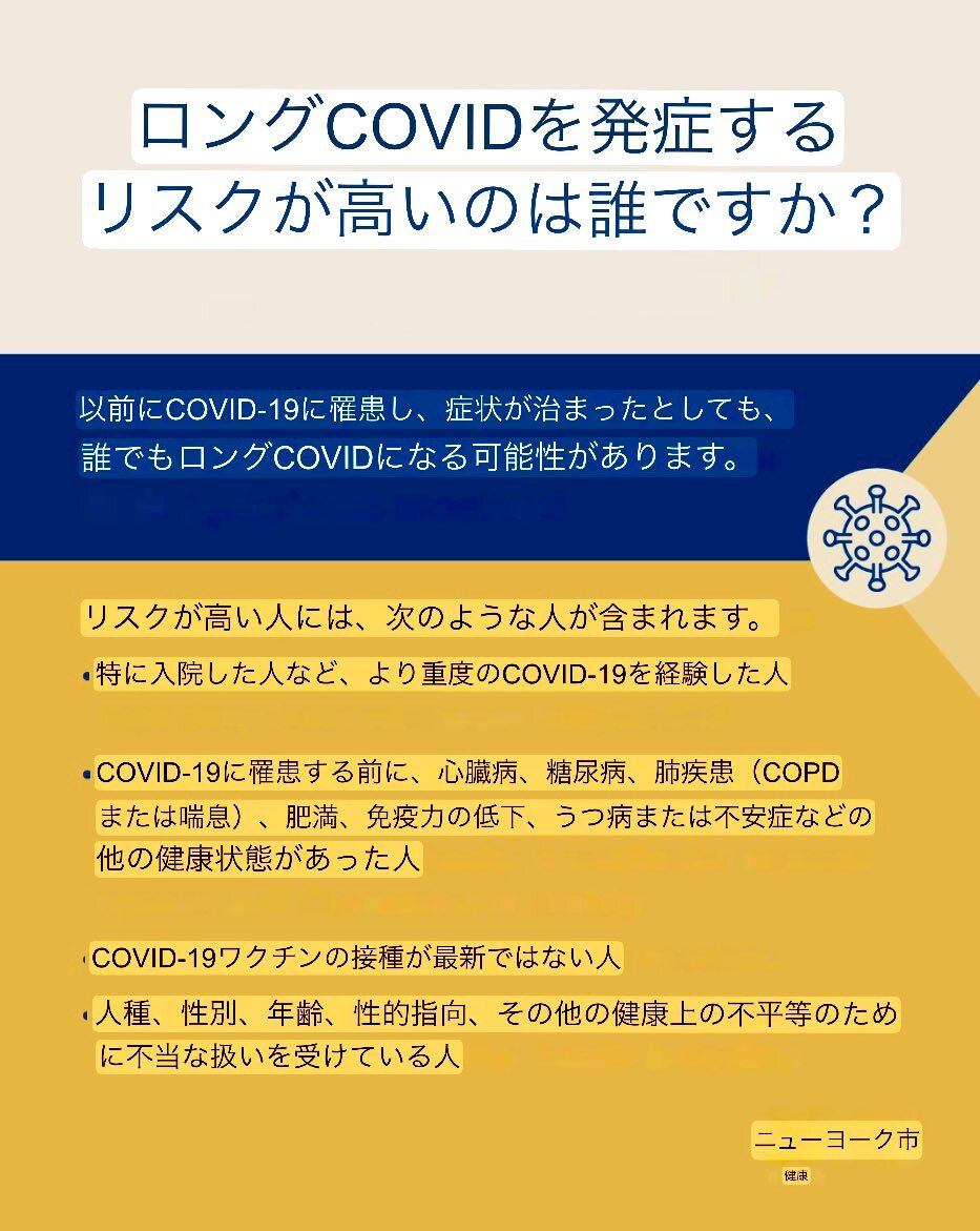 🇺🇸ニューヨーク市保健局 10/14 ロングCOVID(コロナ後遺症)を発症するリスクが高いのは誰? 新型コロナに感染し、症状が治まったとしても、誰でもロングCOVIDになる可能性があります 🚊😷🏫 #後遺症あるぞコロナを無視するな #公共交通機関は窓開けとマスクを推奨してください #感染症から子どもを守れ x.com/nychealthy/sta…