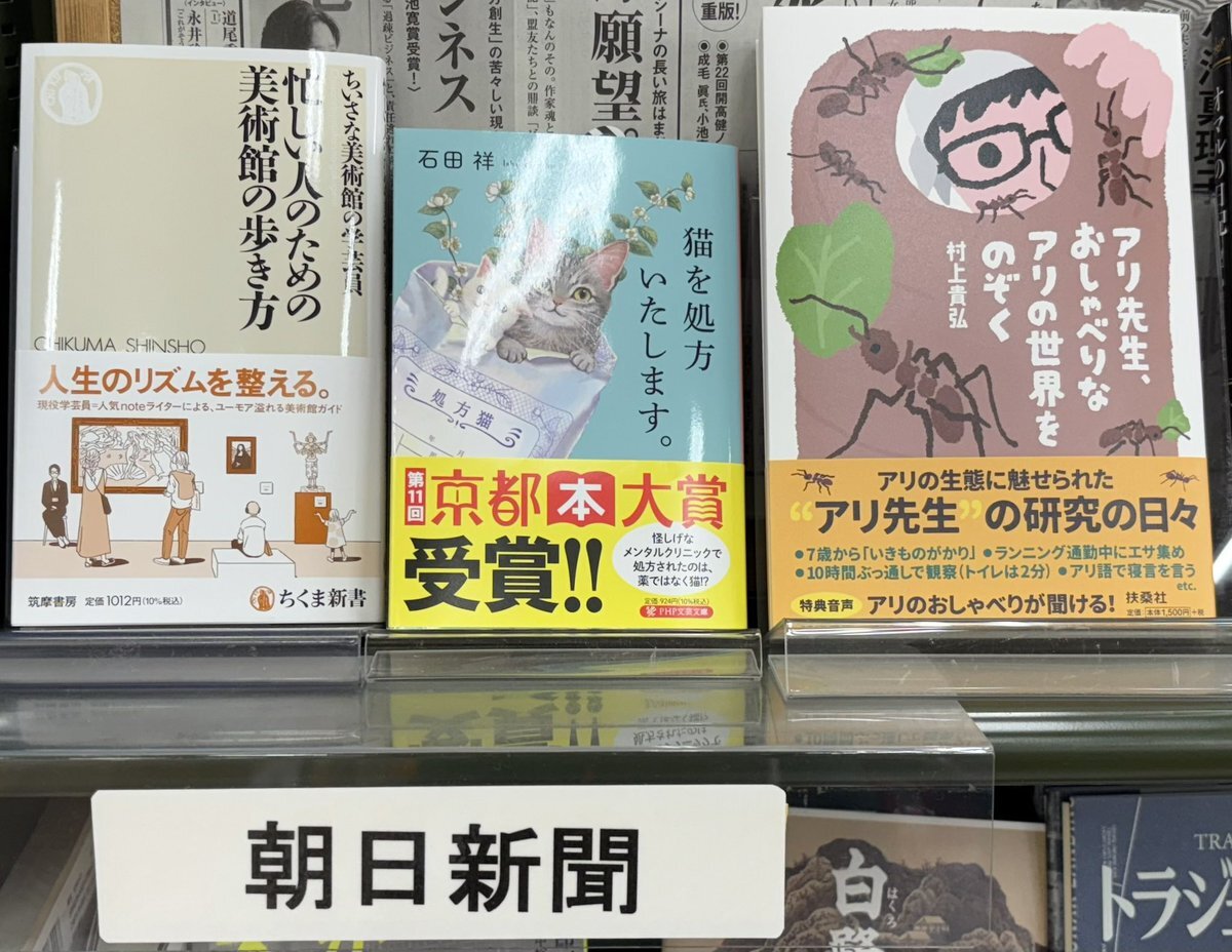 ◆◆ 今週の書評 ◆◆ #朝日新聞 ・ 猫を処方いたします(#PHP文芸文庫) ・ 忙しい人のための美術館の歩き方 (#ちくま新書) など、店頭に在庫ございます♪(╹◡╹) pic.x.com/vkFlSm3bg8