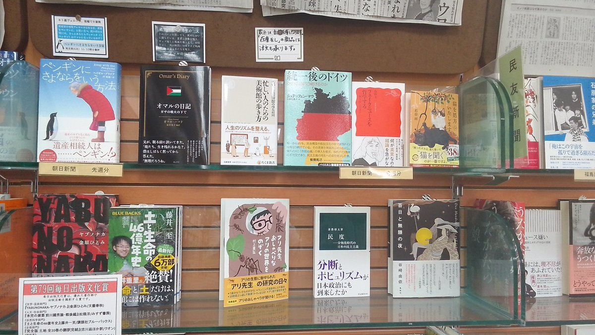 書評コーナー更新🧸📰 #朝日新聞 『忙しい人のための美術館の歩き方』 #ちくま新書 『統一後のドイツ』 #白水社 『フェイクニュースを哲学する』 #岩波新書 『猫を処方いたします 5』 #PHP文芸文庫 など、ございます。 在庫のない商品はお取り寄せも承ります。 #会津若松 pic.x.com/mWMd7aoxPl