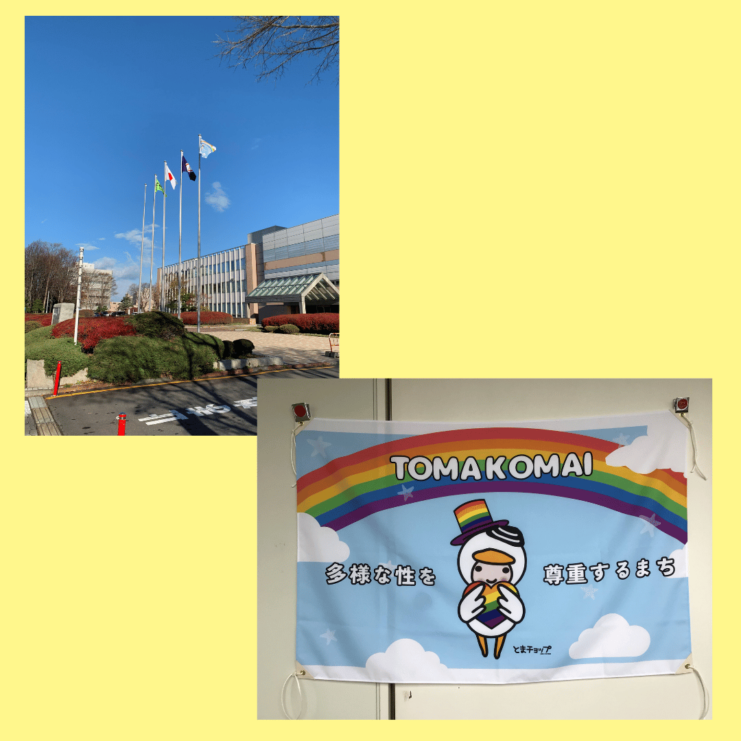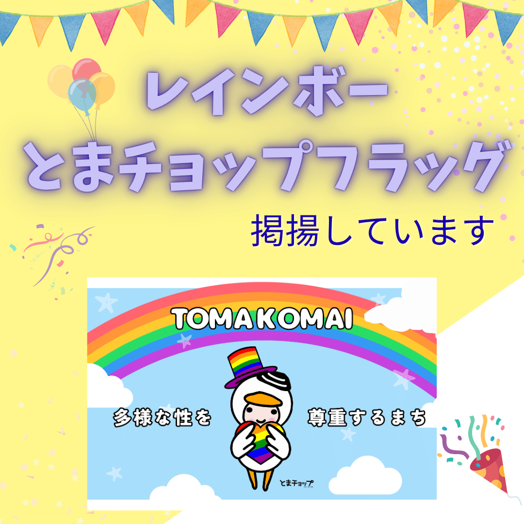 市役所正面玄関前にレインボーとまチョップフラッグが掲揚されています🌈 また正面玄関入口の吹き抜けにPRIDE指標ゴールド&レインボー認定の横断幕が設置されています🎶 どちらも11月28日(金)まで設置してありますので市役所へお立ち寄りの際は是非ご覧ください😊 #PRIDE指標2025 #苫小牧市 pic.x.com/Qbqz2T9Pu6