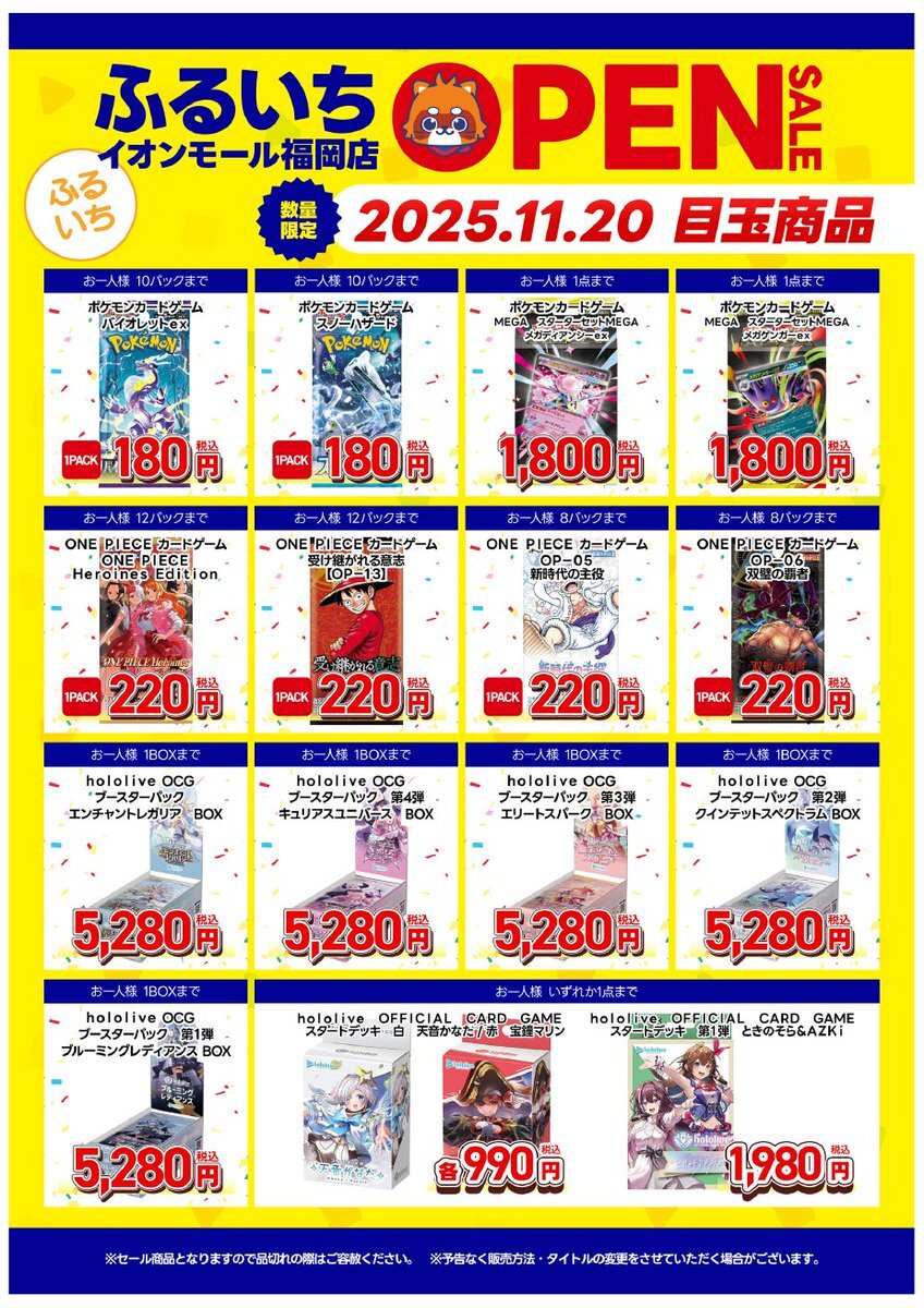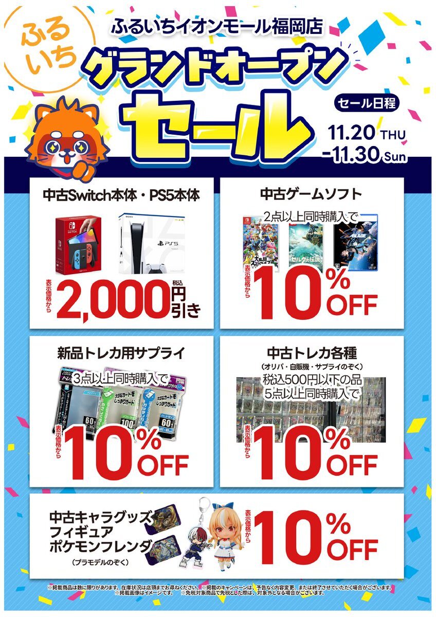 【#グランドオープンセール!!】 #ふるいちイオンモール福岡店 です!! いよいよ今週木曜日オープン!! セールについてご案内!!! 🔴中古 #Switch本体・#PS5本体【表示価格から2,000引き!!】 🔵中古 #キャラクターグッズ【表示価格から10%OFF!!】 目玉商品もご用意してます!! 11/20はぜひふるいちまで!! pic.x.com/yCH23fvxjz