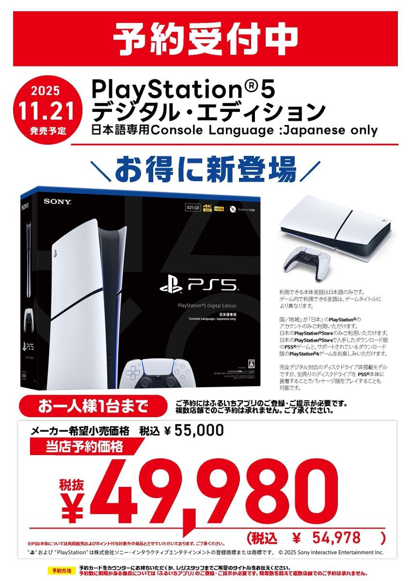 2025年11月21日(金) PS5デジタルエディション 日本語専用が \超オトクな価格で新登場/ 🎮ご予約を受け付け開始🎮 ※会員様限定(当日登録可) ※予約埋まり次第終了します。 #イオンモール高の原店 #ふるいち #PS5 #PS5本体 #ゲーム本体 pic.x.com/KR5dO5MwGG x.com/PlayStation_jp…