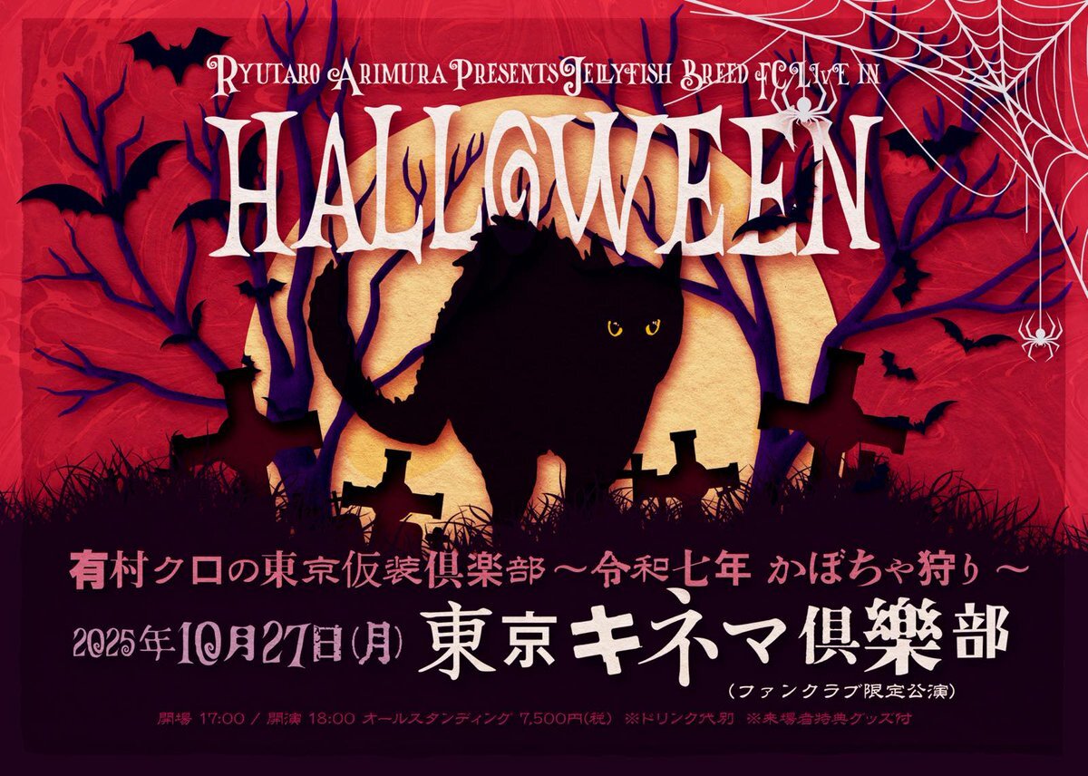 10/27(月)Ryutaro Arimura Presents JellyFish Breed FC LIVE in HALLOWEEN 有村クロの東京仮装倶楽部 ~令和七年 かぼちゃ狩り~ にご来場の皆様へ 📅2025年10月27日(月) 📍東京キネマ倶楽部 必ず下記をご確認の上、ご来場をお願いいたします。 plastic-tree.com/various/news/?… #PlasticTree pic.x.com/alRpv2ZkKh