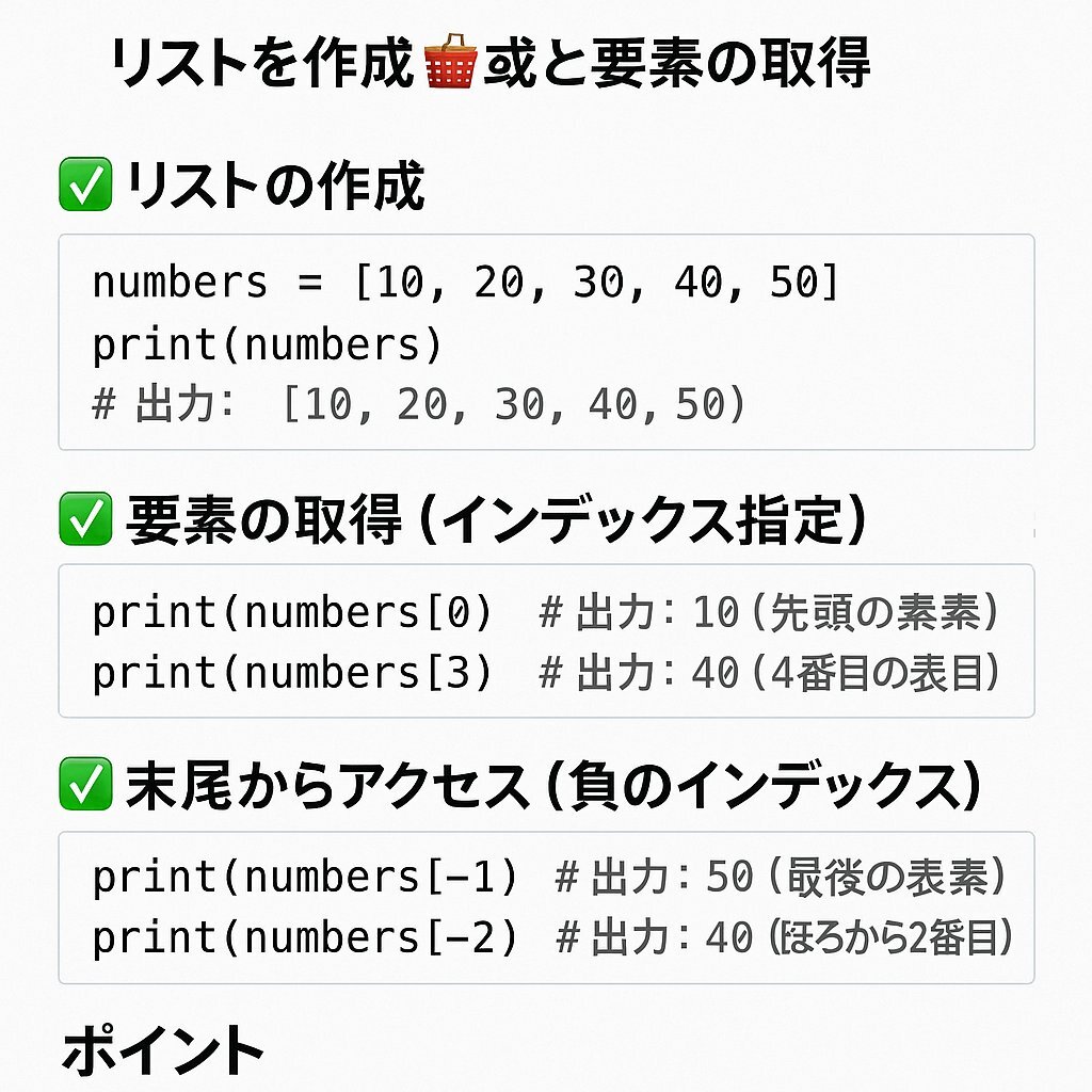 Python入門 #62:リストの作成と要素の取得 リストの中から“欲しいデータ”を取り出そう! ✅ list[index] で指定位置の要素を取得 ✅ [-1] で末尾を取得 ✅ データ操作の基本ステップ #Python入門 #Python講座 #リスト #インデックス #Python初心者 #プログラミング学習 #PythonTips pic.x.com/BuCdOPExiA