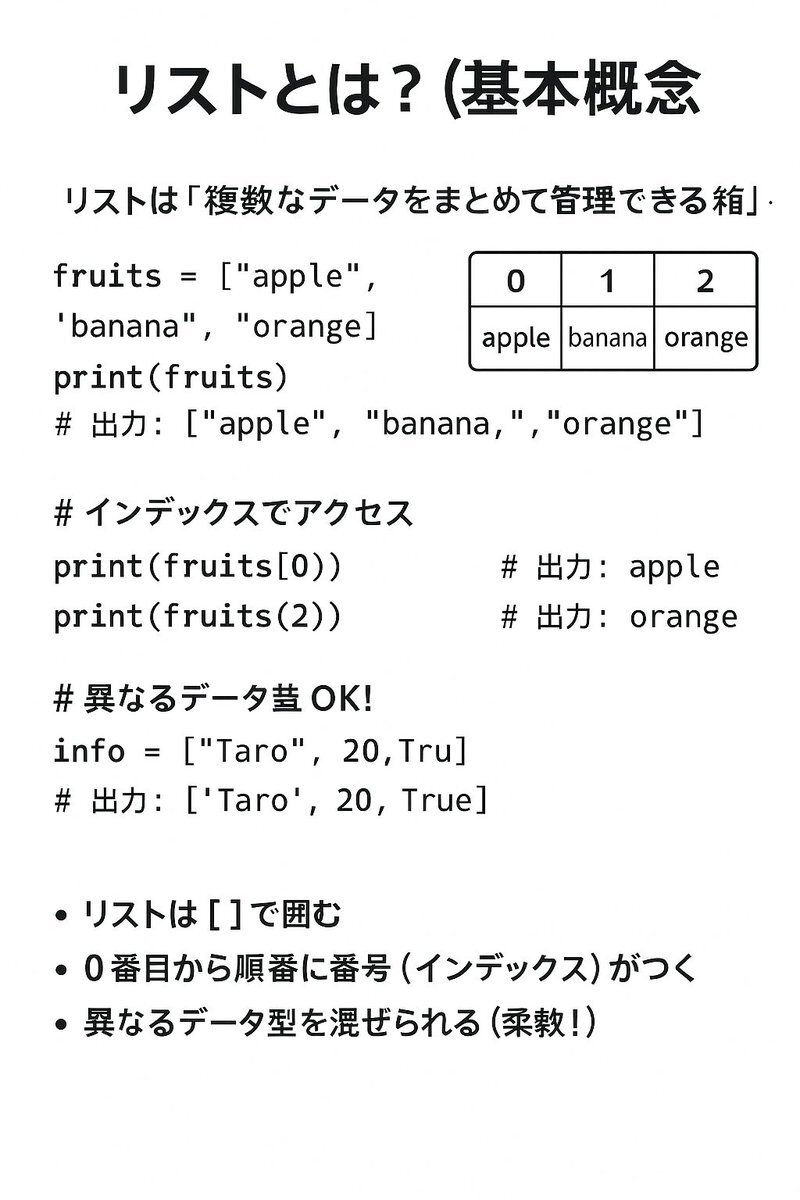 📌 Python入門 #61:リストとは?(基本概念) 📚 リストとは「データのグループ」! ✅ [] で作る ✅ インデックスで個別アクセス ✅ 型が違ってもOK! 🔰 複数データをまとめて扱いたい時の基本構造です #Python入門 #リスト #Python初心者 #プログラミング学習 #PythonTips #データ構造 pic.x.com/SwsM94xeCC
