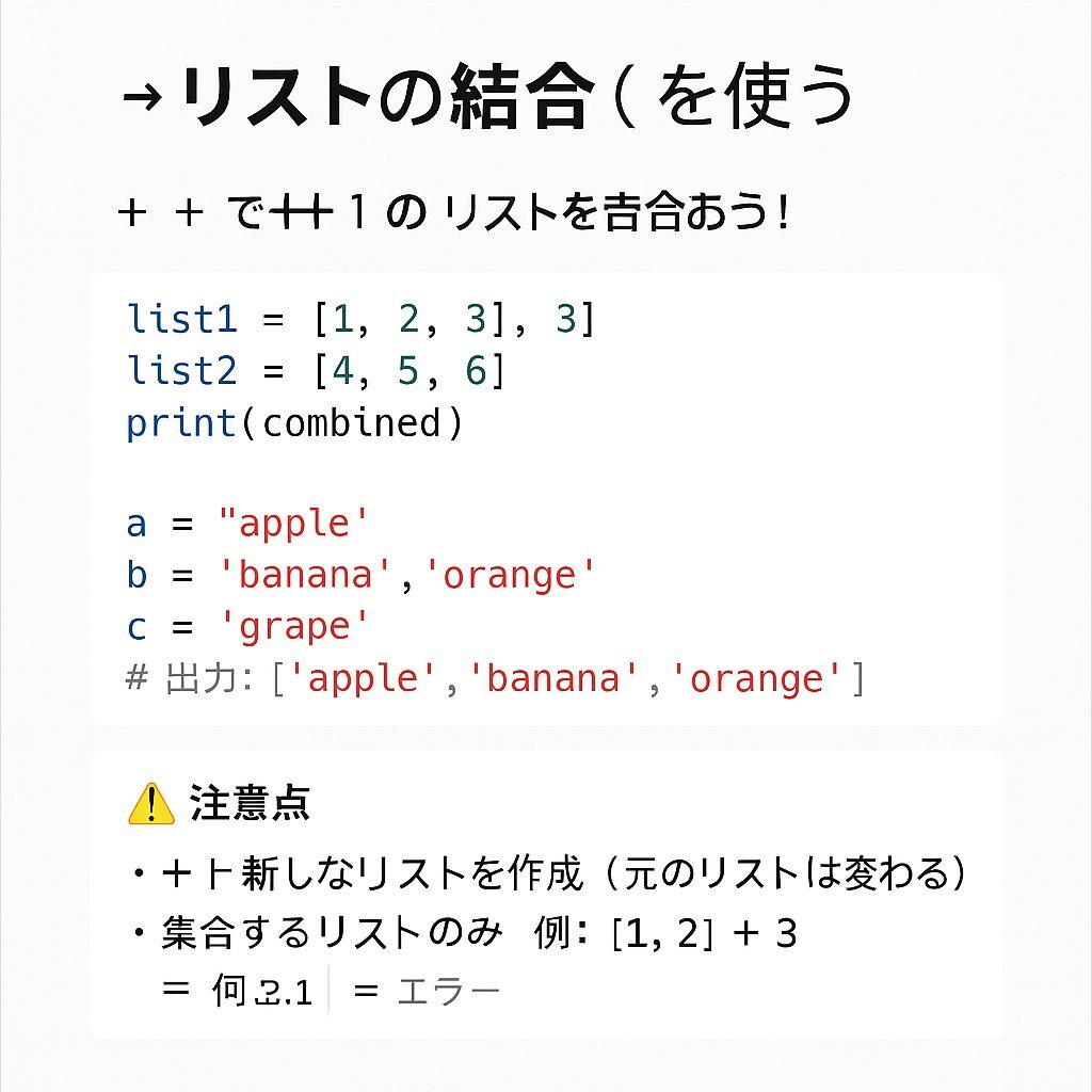 Python入門 #67:リストの結合(+ を使う) Python入門 #67:+ を使ってリストを結合! + を使えば、複数のリストをまとめて1つにできます。 とても直感的で、データ操作でよく使う基本テクです #Python入門 #Python講座 #リスト結合 #Python初心者 #プログラミング学習 #PythonTips #データ操作 pic.x.com/QNpc2Fu6fi