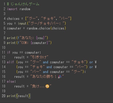 【Python基礎】じゃんけんゲームを作ろう!(19行) 📚学べること ・リスト(配列)の基本 ・random.choice()でランダム選択 ・論理演算子(and, or)の使い方 ・複雑な条件式の書き方 ・ゲームロジックの考え方 条件分岐の応用が身につく!🎮 #Python初心者 #ゲーム制作 #プログラミング pic.x.com/MPIhujgKWo